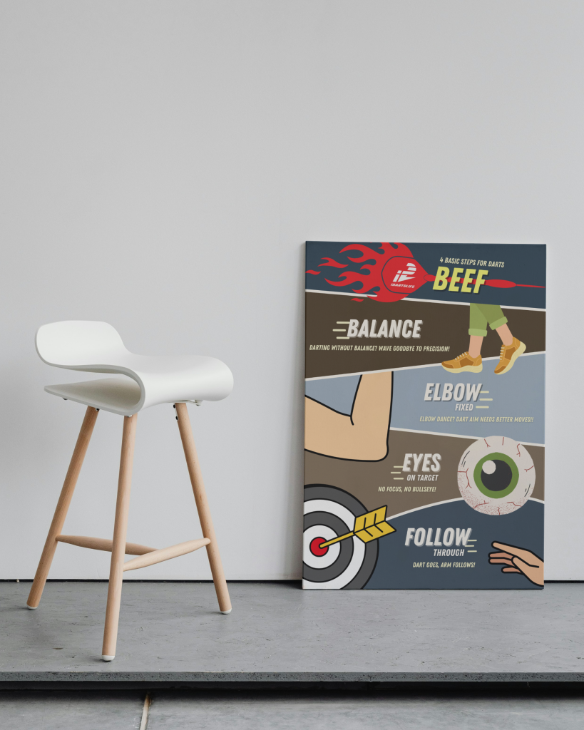 BEEF stands for Balance, Elbow Up, Eyes on Target, and Follow Through. Four fundamentals every darts player needs.